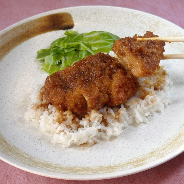 兵庫県加古川市の人気メニュー「かつめし」。国産豚ヒレカツに特製ソースをブレンドしたオリジナルのタレを絡め、茹でキャベツを添えた本格派です。