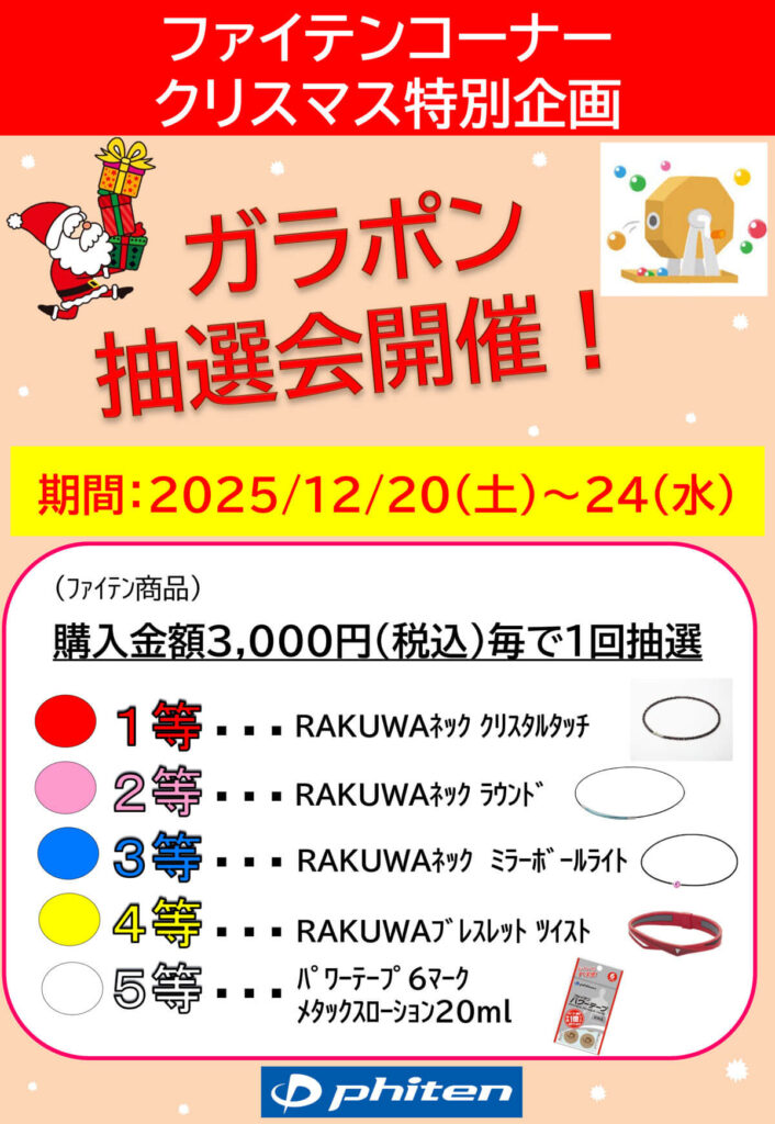 ファイテンコーナーでは「今年もやります!ファイテンクリスマス抽選会」を開催いたします。